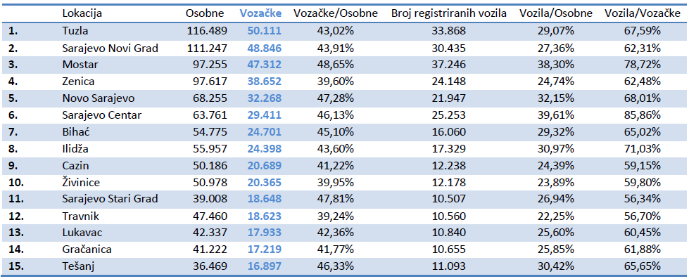 Top 15 općina FBiH - Odnos vozačke/osobne