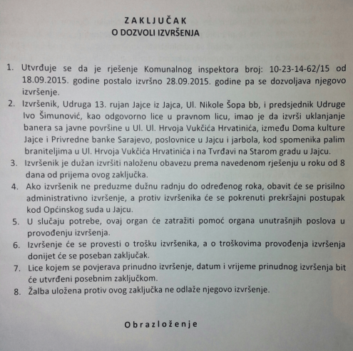 Rješenjem komunalnog inspektora Općine Jajce naloženo je Udruzi „13. rujan“ Jajce uklanjanje jarbola koji se nalaze na spomen obilježju poginulim braniteljima Domovinskog rata. Udruga je žalbom upućenom načelniku Općine tražila poništenje takvog akta, ali je žalba kao neosnovana odbijena navodeći da su jarboli sa zastavama bespravno podignuti i da isti moraju biti uklonjeni. Nakon što Udruga nije dobrovoljno uklonila jarbole, uslijedio je i Zaključak o dozvoli izvršenja, odnosno, zaključak o prisilnom uklanjanju jarbola o trošku Udruge, uz sudjelovanje organa unutarnjih poslova ukoliko bude potrebno!